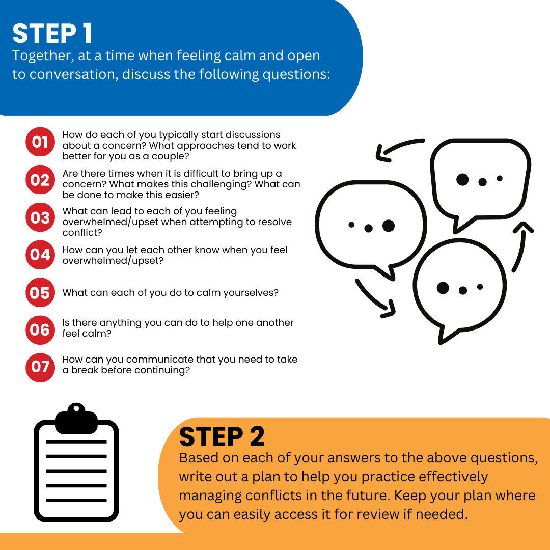 If conflict resolution is a significant challenge in your relationship or if conflict escalation is a concern, please contact an appropriate support service. The Government of Canada provides a list of resources related to family violence and crisis services at the following link.