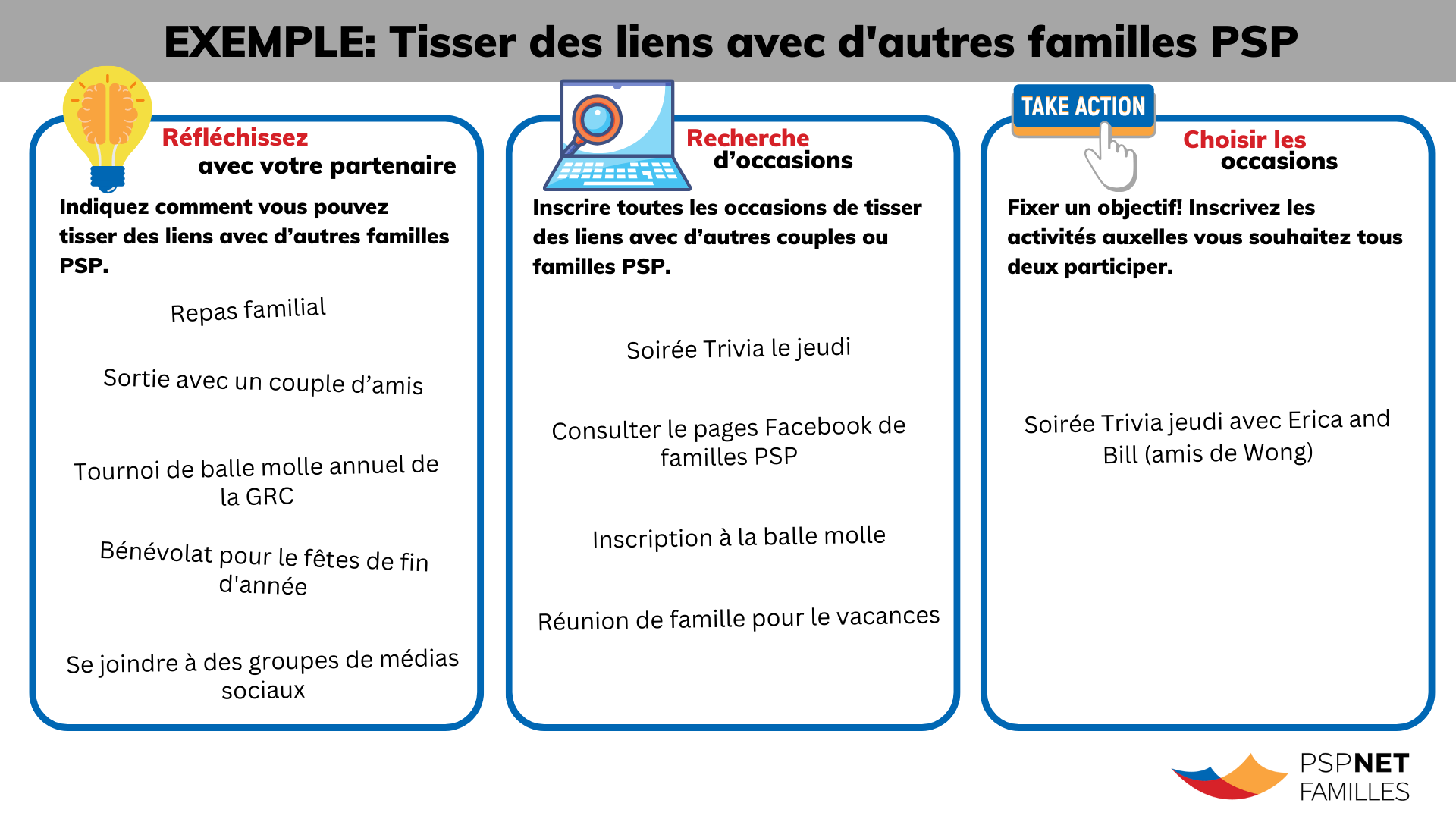 Vous trouverez ci-dessous un exemple sur la façon dont vous et votre partenaire du PSP pouvez planifier de nouer et de renforcer des relations avec d’autres familles du PSP.