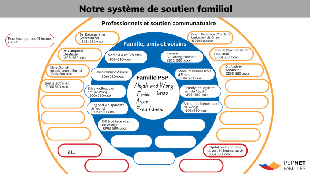 Pensez à toutes les personnes et tous les organismes qui vous soutiennent, vous et votre famille. Pensez à la famille et aux amis sur lesquels vous pouvez compter pour vous aider, aux fournisseurs de soins aux enfants, aux professionnels de la santé (p. ex., médecin de famille, psychologue), à d’autres services professionnels (p. ex., mécanicien, garde d’animaux), aux services d’urgence 24 heures sur 24, etc. Examinez cet exemple de cercle de soutien pour une famille du PSP fictive (Aliyah et Wong).