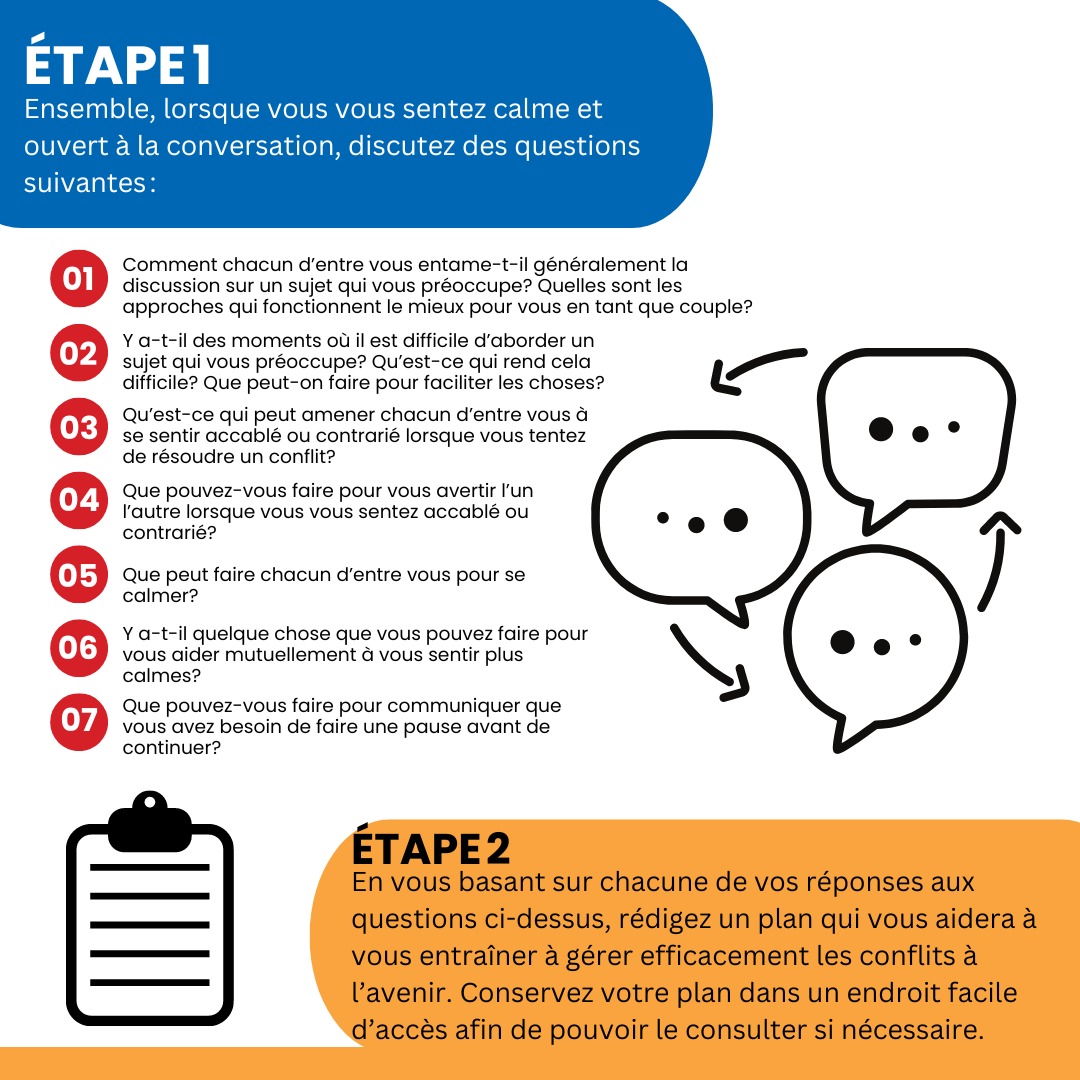 Si la résolution des conflits constitue un défi important dans votre relation ou si l’escalade des conflits vous préoccupe, veuillez communiquer avec un service de soutien approprié. Le gouvernement du Canada propose une liste de ressources relatives à la violence familiale et aux services de crise au lien suivant.